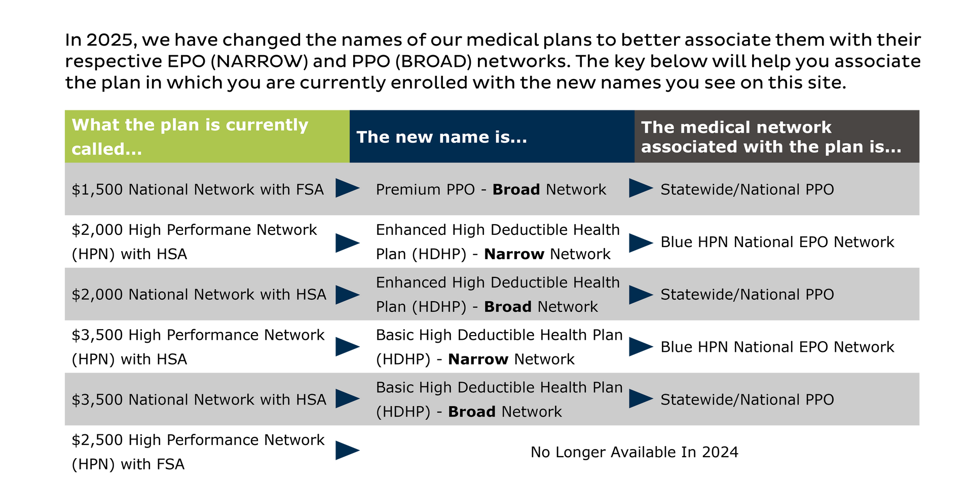For the upcoming plan year, effective January 1, if you choose the Basic or Enhanced Plan, you may choose to pair your plan with either a Narrow or Broad Network within Blue Cross Blue Shield of Arizona.