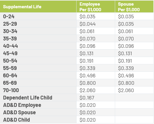 You must purchase supplemental coverage for yourself in order to purchase coverage for your spouse and/or dependents. When you enroll you will see your exact cost for coverage based on your age and how much you buy. Benefits will reduce by 50% at age 70. For Spouse coverage benefits will reduce by 100% at age 70.